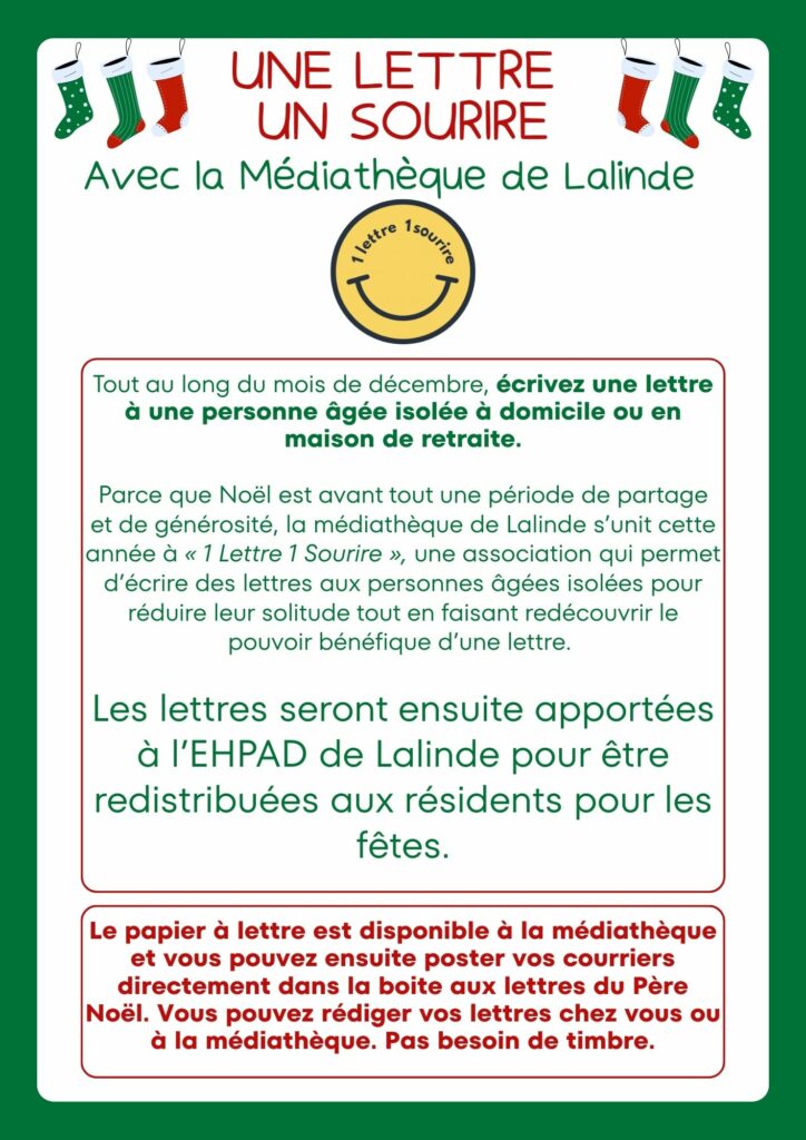 Parce que Noël est avant tout une période de partage et de générosité, le Secrétariat du Père Noël s’unit cette année à « 1 Lettre 1 Sourire », une association qui permet d’écrire des lettres aux personnes âgées isolées pour réduire leur solitude tout en faisant redécouvrir le pouvoir bénéfique d’une lettre. Cette année, le Père Noël invite enfants et adultes à participer à cet élan en envoyant des messages bienveillants aux seniors. Ces précieuses attentions seront partagées aux résidents de l’EHPAD afin d’apporter chaleur et réconfort en cette période de fête.